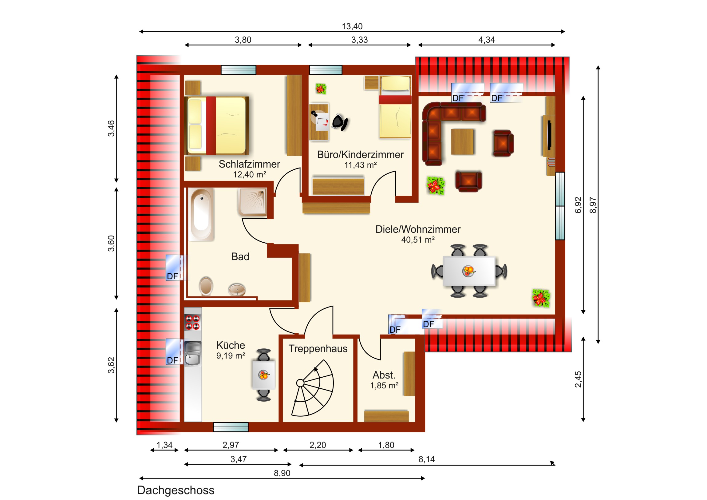 ◆ Dach Satteldach 45° m. roten Betonsteinen eingedeckt