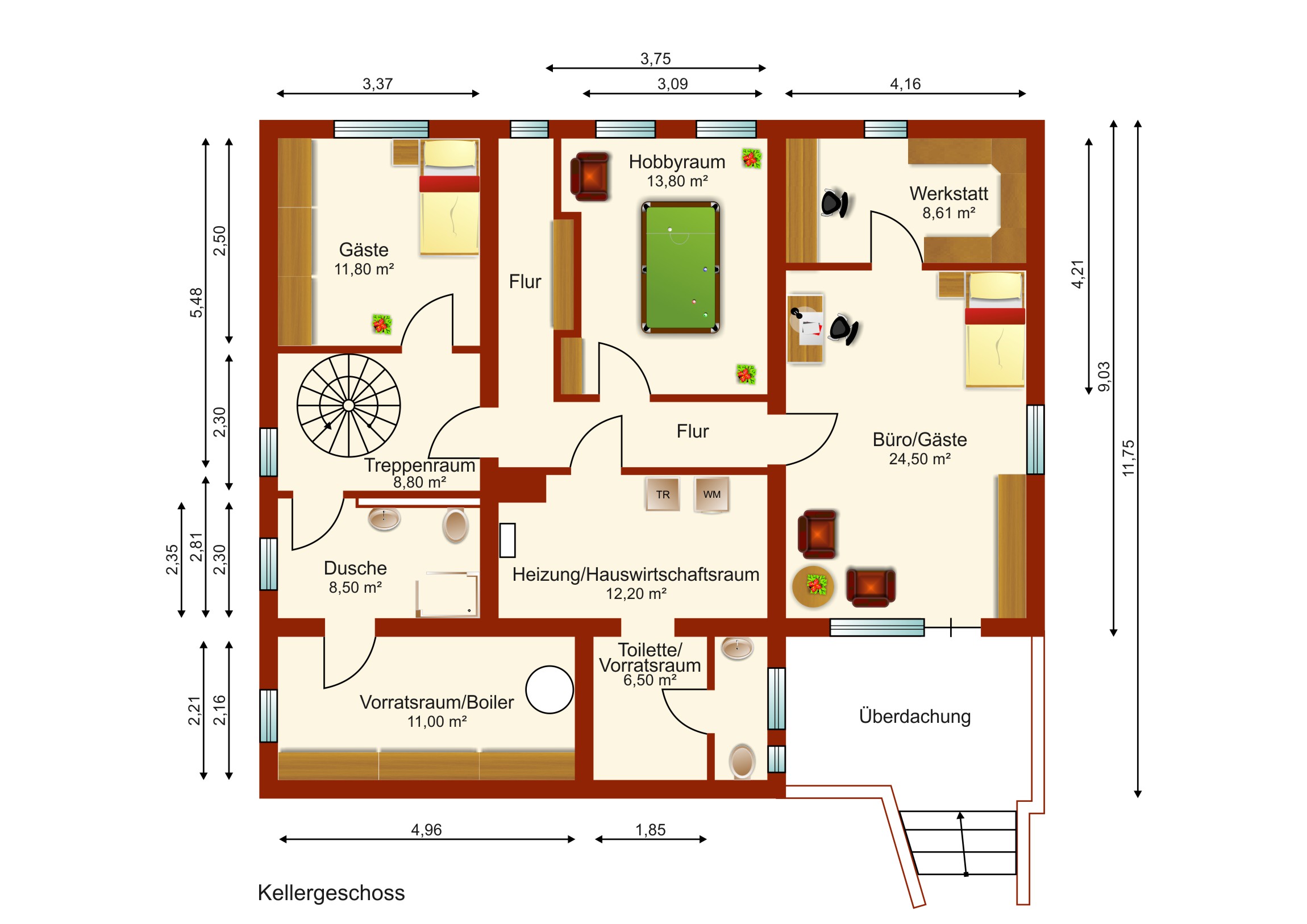 ein Gästezimmer mit Duschbad, einen Hobbyraum, eine Werkstatt (ca. 9 m²), einen Heizungsraum mit ca. 12 m² Wirtschaftsfläche, sowie einen praktischen Vorratskeller.